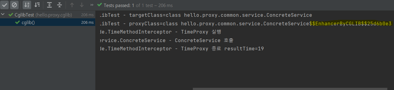 동작 방식은 JDK 동적 프록시와 비슷하다. 이렇게 CGLIB로 프록시를 만들면 프록시 이름에 $$EnhancerByCGLIB$$xxx 라고 붙는다.