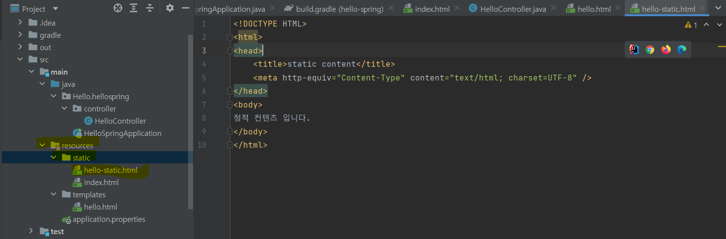 - resources에 hello-static.html 있어서 웹 브라우저에 hello-static.html 반환