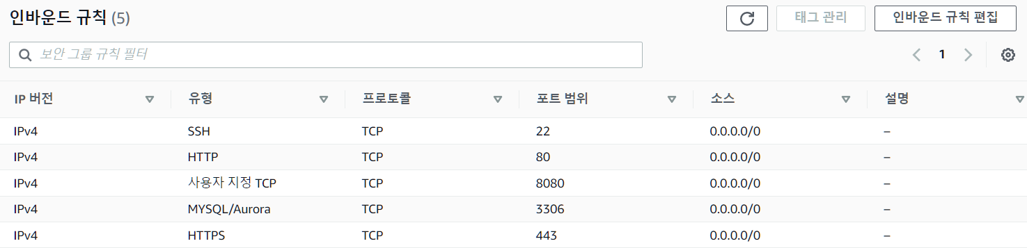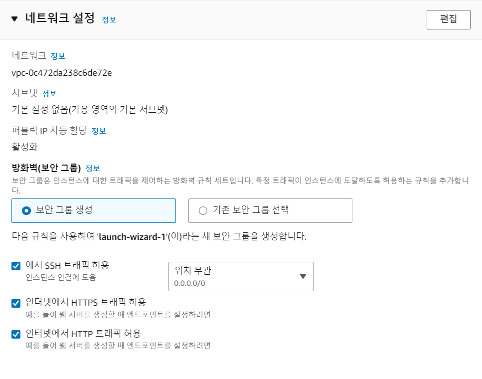 7. 방화벽(보안 그룹)은 이전에 생성해 둔 것이 없다면 보안 그룹 생성을 선택한다. 인스턴스 생성 후에 보안 그룹에는 MySQL의 대표적인 포트 번호인 3306을 추가하면 된다.