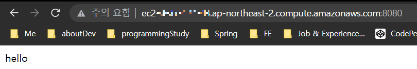 위와 같은 화면이 아닌 whitelabel 에러가 반겨줄 것이다. 나의 경우는 / 경로로 접속하면 hello를 출력하도록 미리 컨트롤러를 작성해 뒀다.