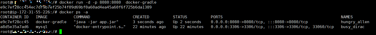 빌드가 잘 되었다면 아래 명령어를 입력하여 실행한다. 아래 명령어에 -d 옵션을 줘서 데몬으로 띄울 수 있고 -p 8080:8080 처럼 옵션을 줘서 포트를 명시해 줄 수 있다. 실행 전, 인스턴스 보안 그룹에 8080 포트가 열려있는지 확인을 꼭 하자