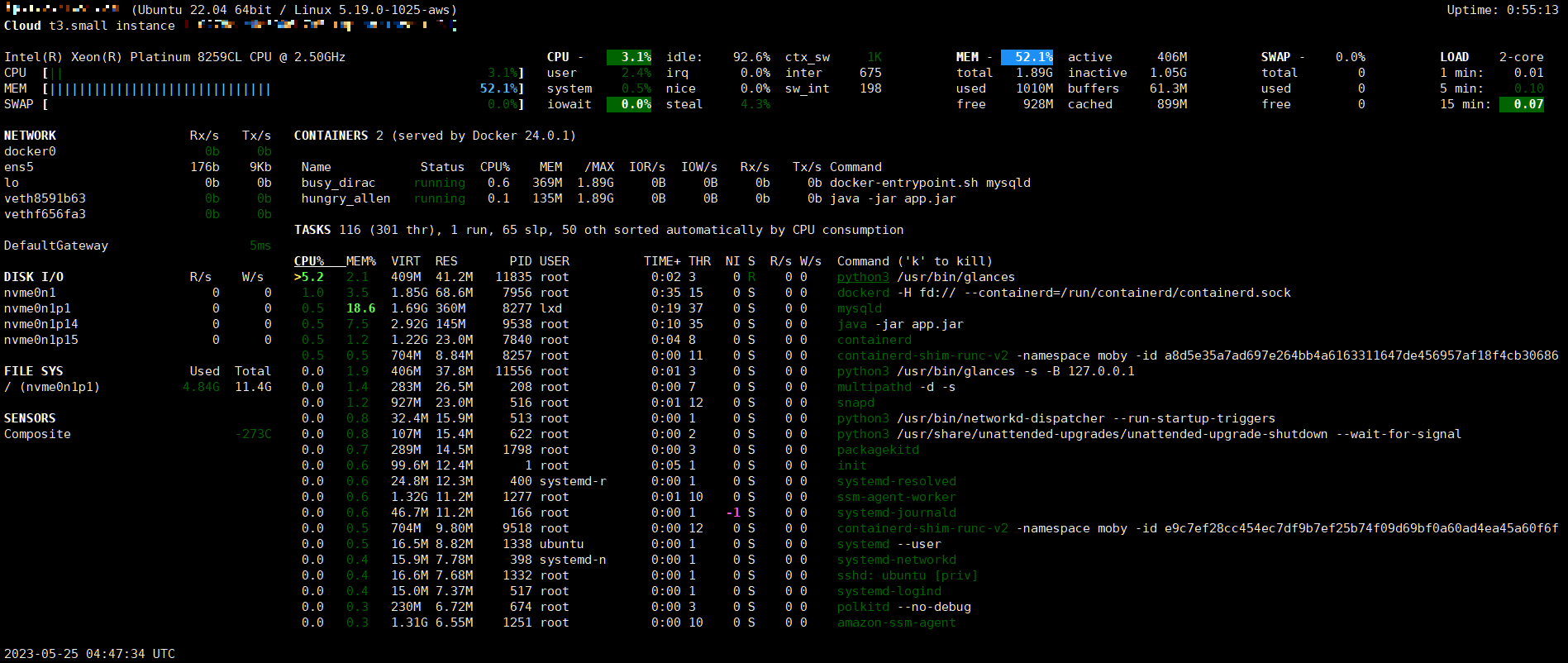 위 화면 기준으로는 현재 2개의 Docker Container가 띄워져 있고, 전체 메모리 1.89G 중 1.00G를 사용했다고 확인할 수 있다. 이 외에도 정말 다양한 정보를 제공하고 있으니 아래 링크를 확인하여 알아보자.