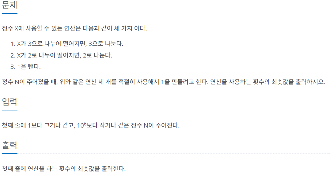 1로 만들기 문제 정수 X에 사용할 수 있는 연산은 다음과 같이 세 가지 이다. X가 3으로 나누어 떨어지면...