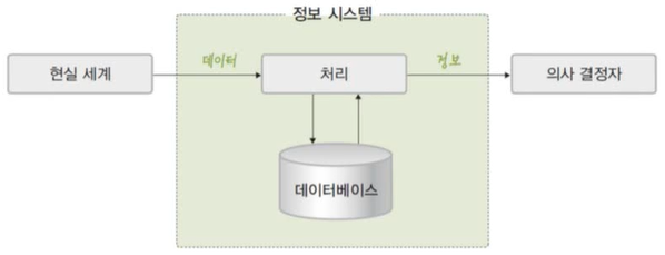 - 정보 시스템 안에서 현실 세계의 데이터를 저장하고 있다가(데이터의 집합) 필요할 때 정보 제공
