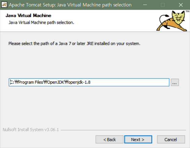 자바 실행환경을 선택하는 화면이다. 나는 OpenJDK 1.8이 설치되어 있다. JRE 7 이상이면 되는 듯하다. Next 클릭.