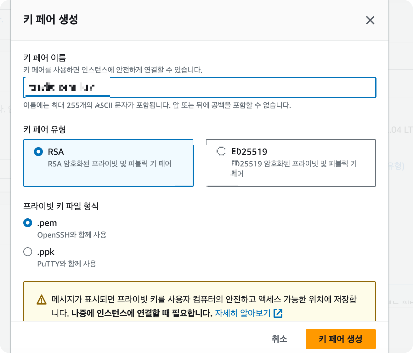 클릭하면 아래와 같은 화면이 나온다. 원하는 이름을 입력하고, 키 페어 유형을 RSA로 선택한다. 아래 프라이빗 키 파일 형식은 보통 `.pem`으로 선택한다. 모두 입력하고 선택했다면 키 페어 생성을 클릭한다.