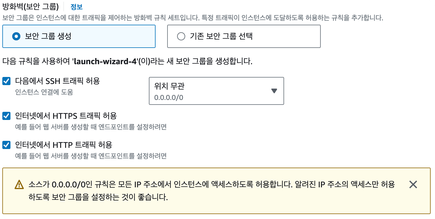 다음은 보안그룹 설정이다. 원하는 대로 보안이 설정된 그룹이 있다면 기존 보안 그룹을 선택하거나, 아니라면 보안 그룹 생성을 선택한다.
