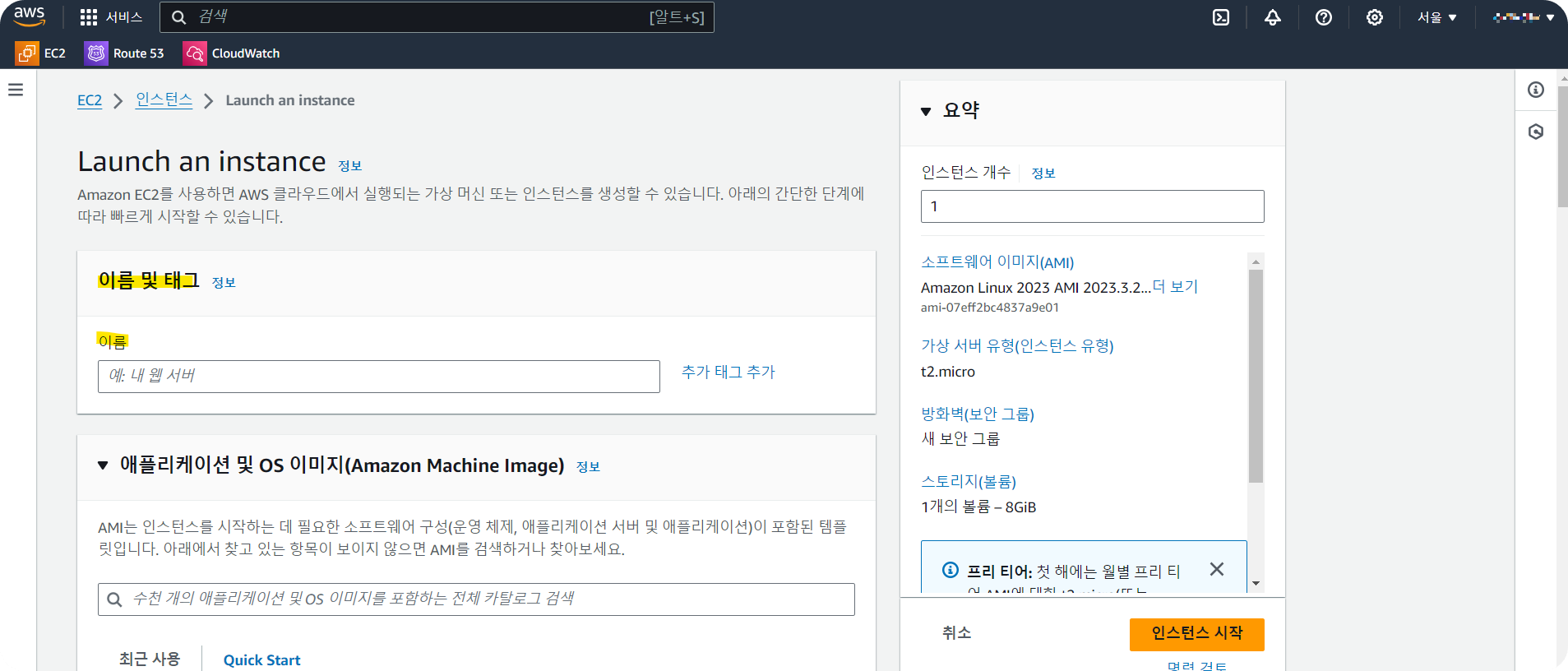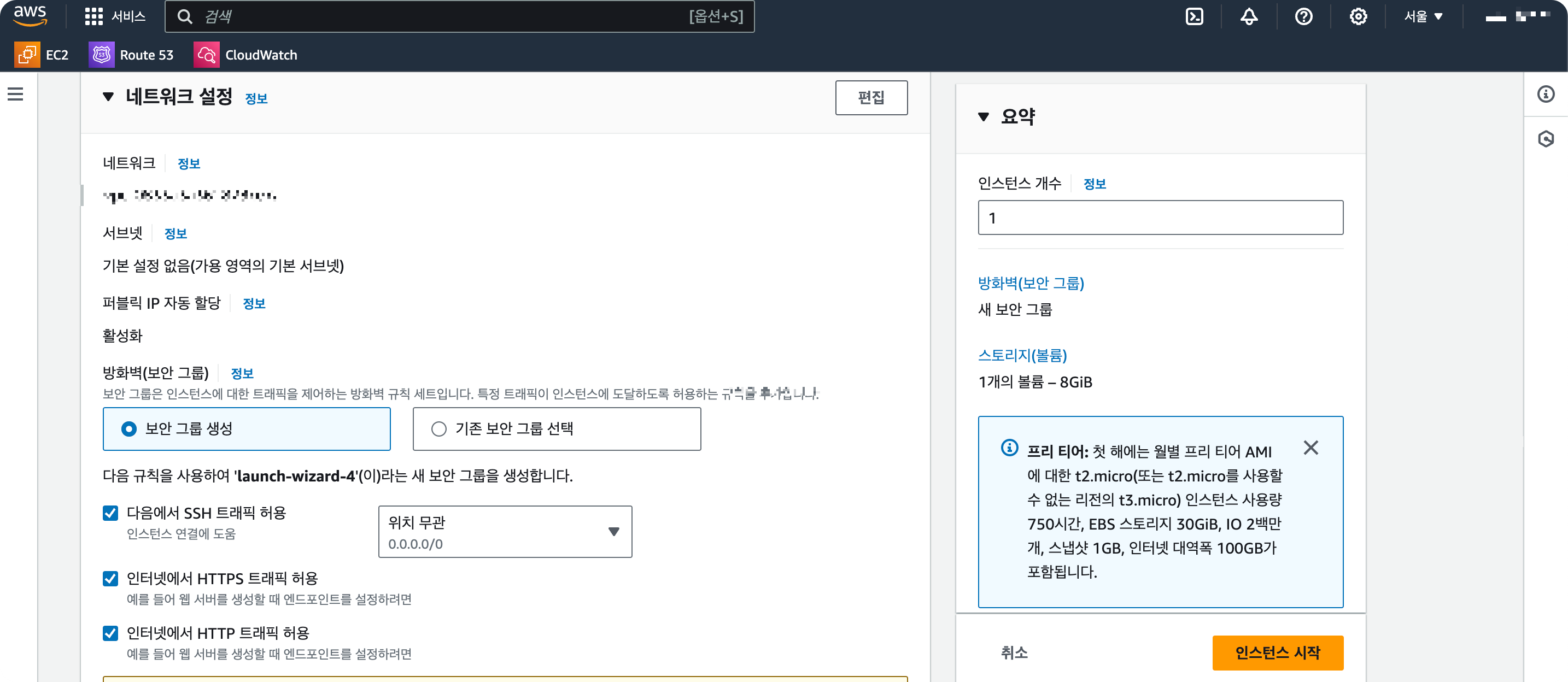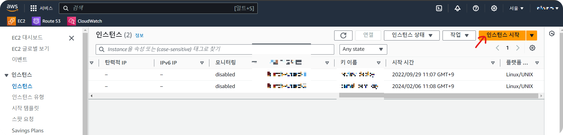 다 설정했다면 오른쪽 하단에 있는 인스턴스 시작 버튼을 클릭하여 인스턴스 생성을 완료한다.