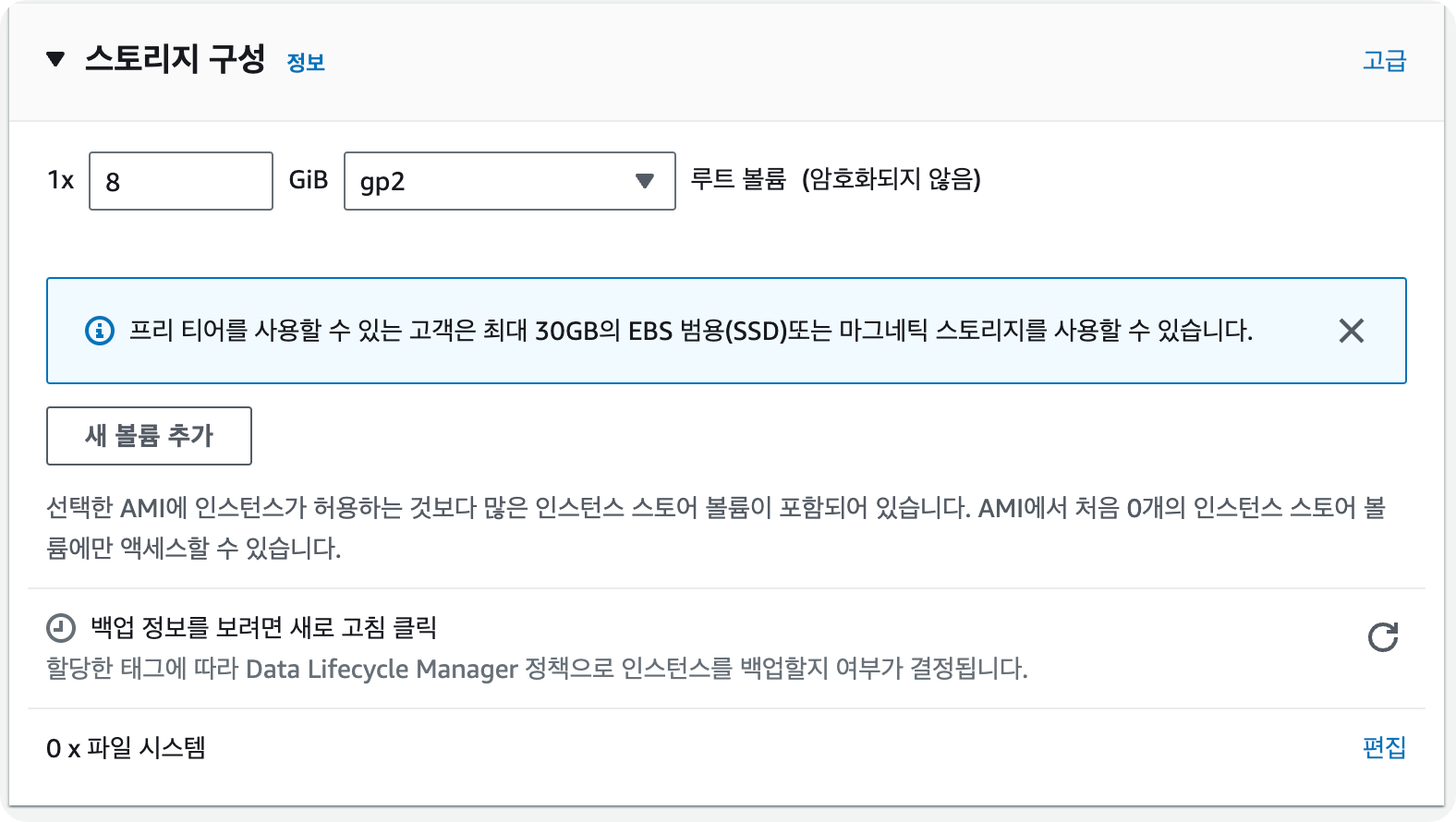 이제 스토리지 구성을 하자. 지금은 최소인 8GB로 설정했다. 하지만 나중에 용량 문제가 발생할 수 있기 때문에 여유가 된다면 12GB로 설정하는 것을 추천하고 싶다.