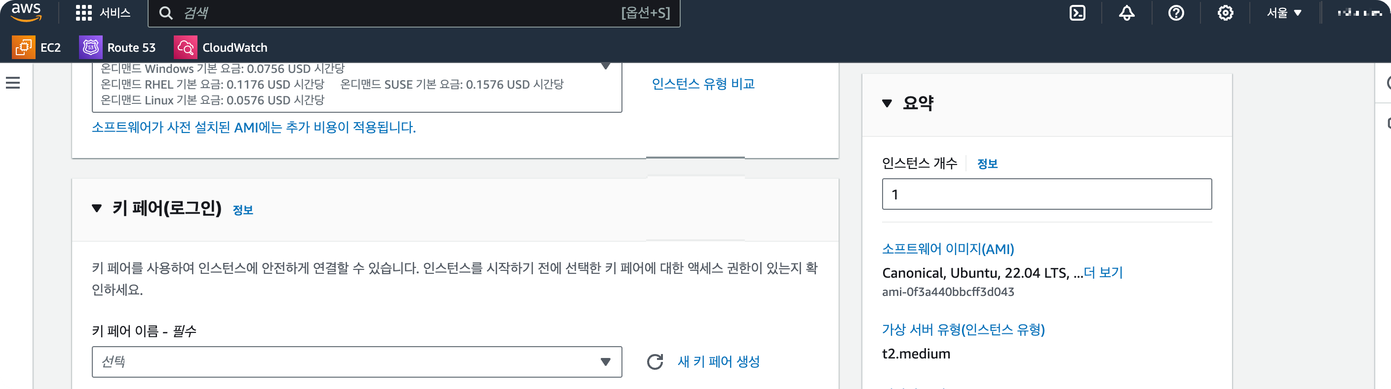 인스턴스 연결 시 사용할 키 페어를 선택하거나 생성한다. 기존에 사용하던 키 페어가 있다면 별도로 생성하지 않아도 된다. 그렇지 않다면 파란색 글씨의 새 키 페어 생성을 클릭하자.