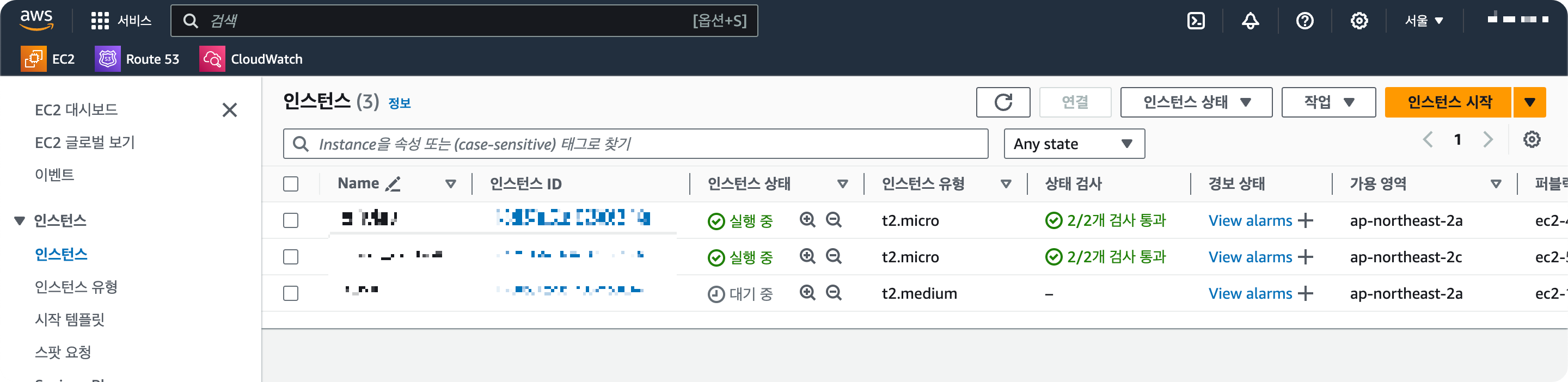 인스턴스 생성은 금방 완료된다. 완료 후 전체 인스턴스를 보면 아래와 같은 화면을 볼 수 있다.