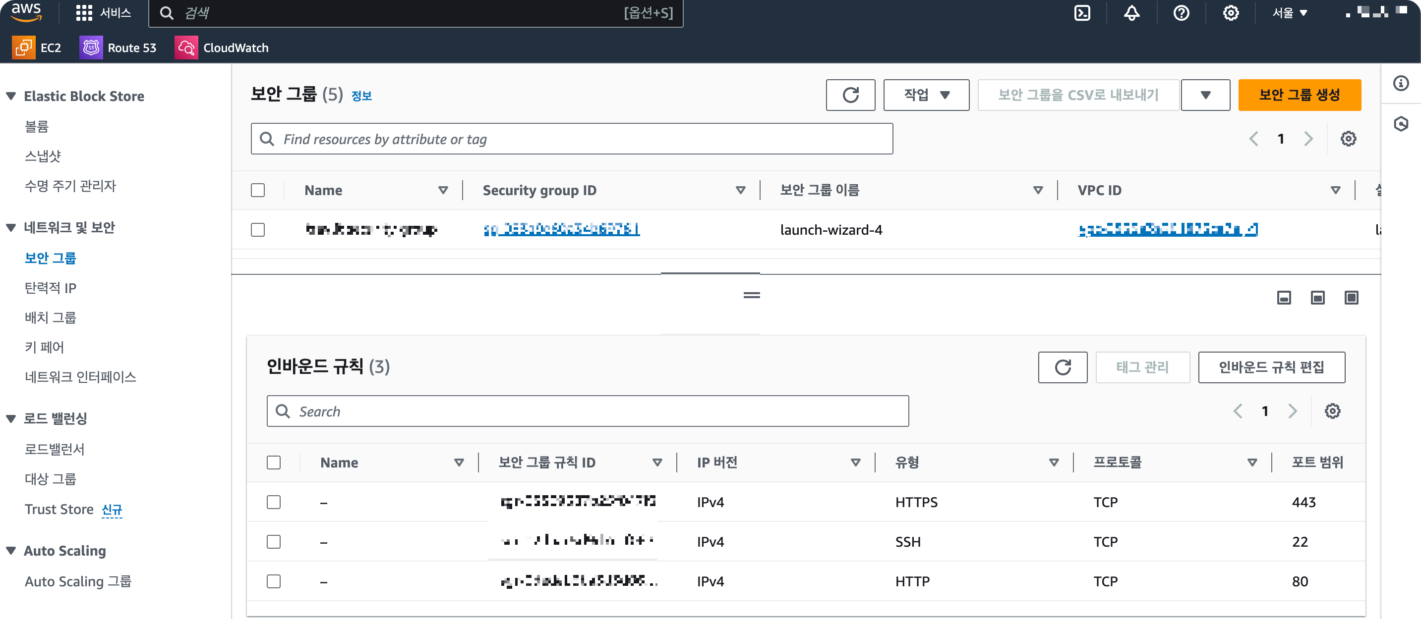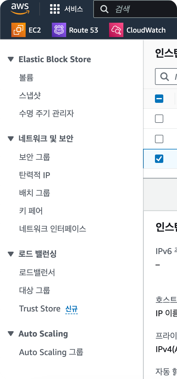 위에서 인스턴스를 생성하면서 보안그룹도 새롭게 생성했다. 해당 보안그룹을 자세하게 설정해야 한다. 아래 화면에서 보안 그룹을 선택한다.