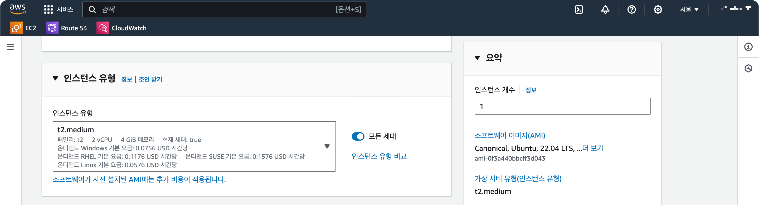 인스턴스 유형을 선택한다. 기본적으로 선택되는 `t2.micro`는 1 CPU, 1GB이므로 매우 작으니 서비스 운영이 힘들 수 있다. 선택 시 좀 더 여유 있는 것으로 고르는 것을 권장한다.