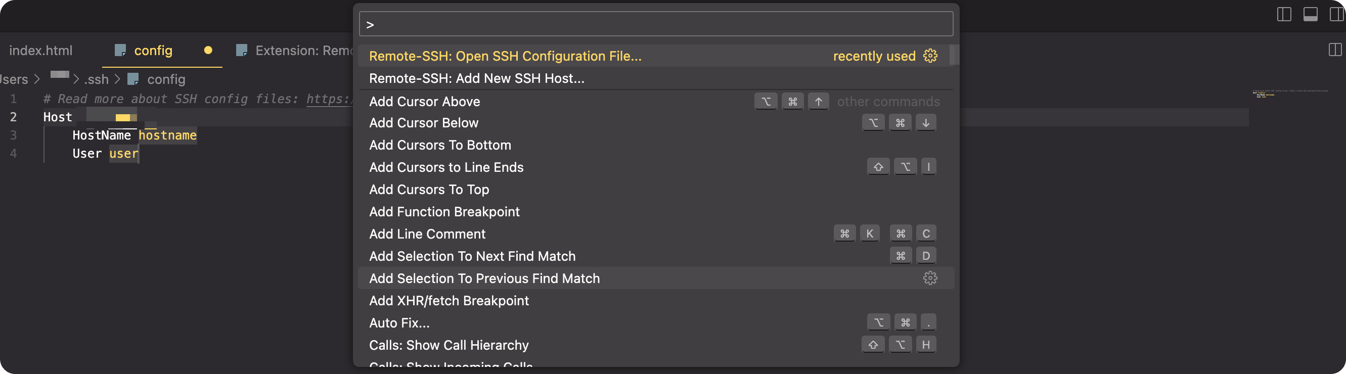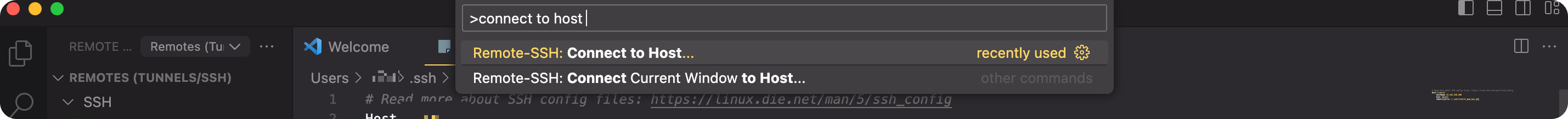 5. 위와 같이 작성하고 저장한다. 다시 vscode 단축키 `ctrl/command + shift + p`를 입력하여 검색창을 띄우고, "connect to host"를 입력하여 클릭한다.