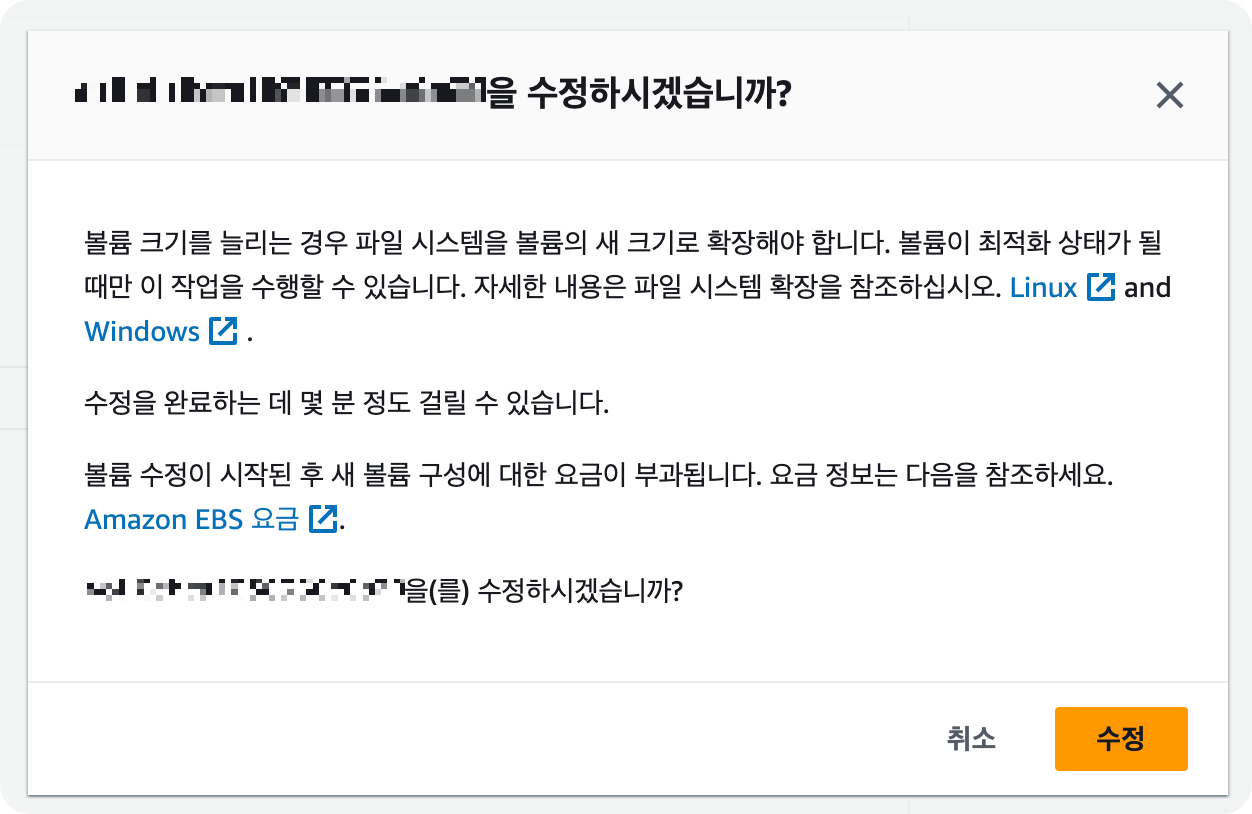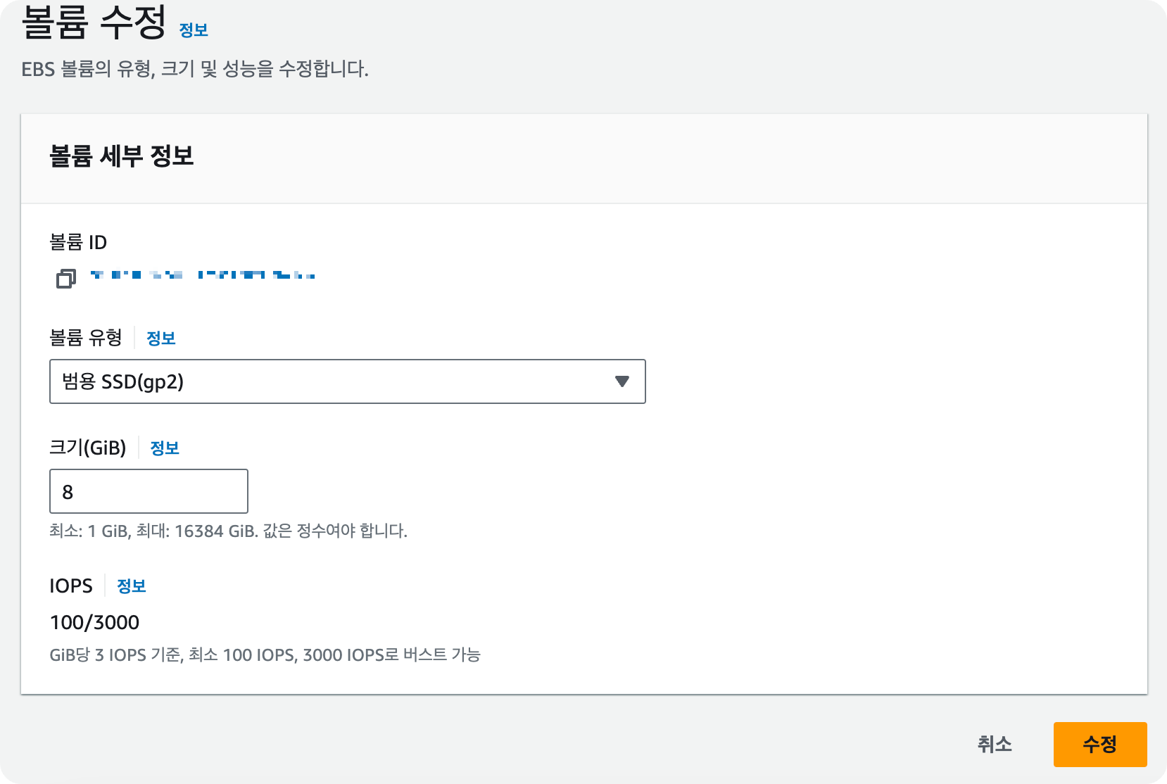 `볼륨 ID`를 오른쪽 마우슨 버튼으로 클릭한다. 아래 화면이 나오면 `볼륨 수정`을 클릭한다.