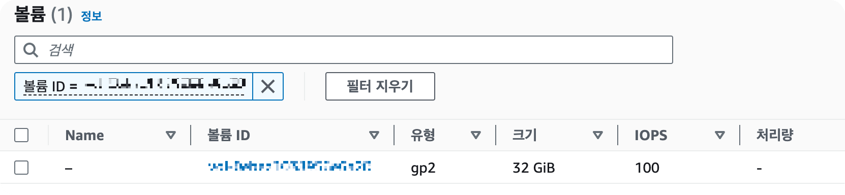 아래 화면에서 인스턴스가 사용하고 있는 블록 디바이스를 확인하고, `볼륨 ID`를 클릭한다.