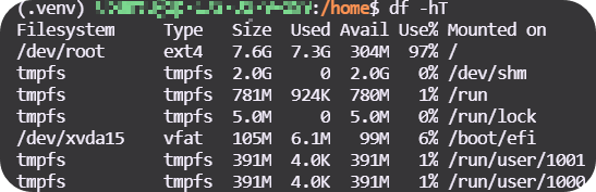 리눅스 `df` 명령어는 파일 시스템 디스크의 용량을 확인할 때 사용한다. `-h` 옵션은 사람이 보기에 편한 용량 크기로 출력한다. `-T` 옵션은 파일의 타입(Type)을 보여주는 항목을 추가한다.