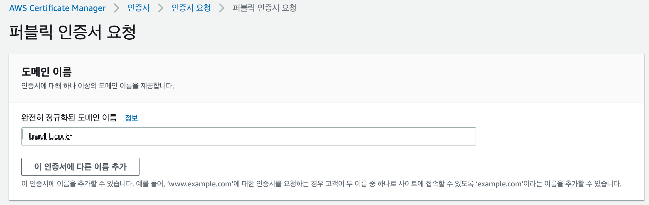 아래 화면에서 먼저 준비해 둔 도메인 이름을 작성한다. 이때 `*.example.co.kr`처럼 와일드카드를 적용할 수 있다.
