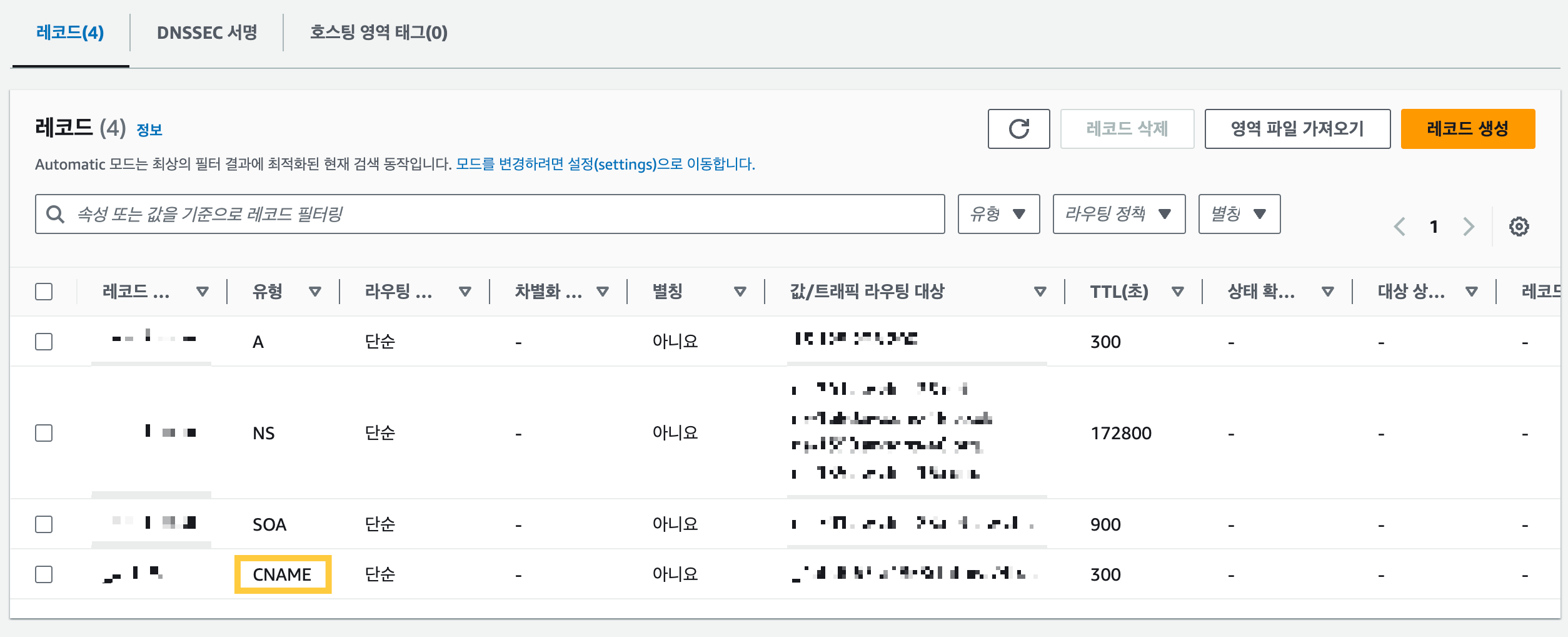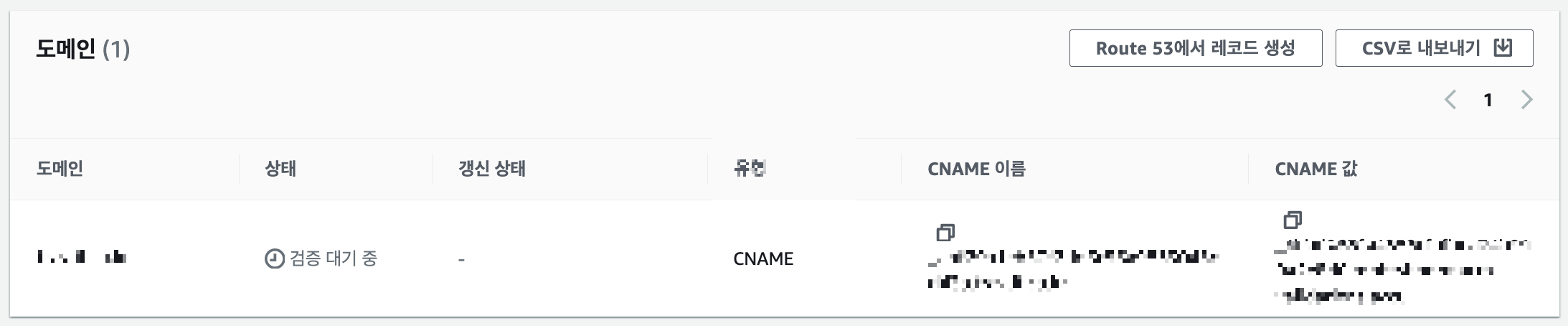 이후 Route 53으로 이동하면 유형이 `CNAME`인 레코드가 생성되어 있는 것을 확인할 수 있다.