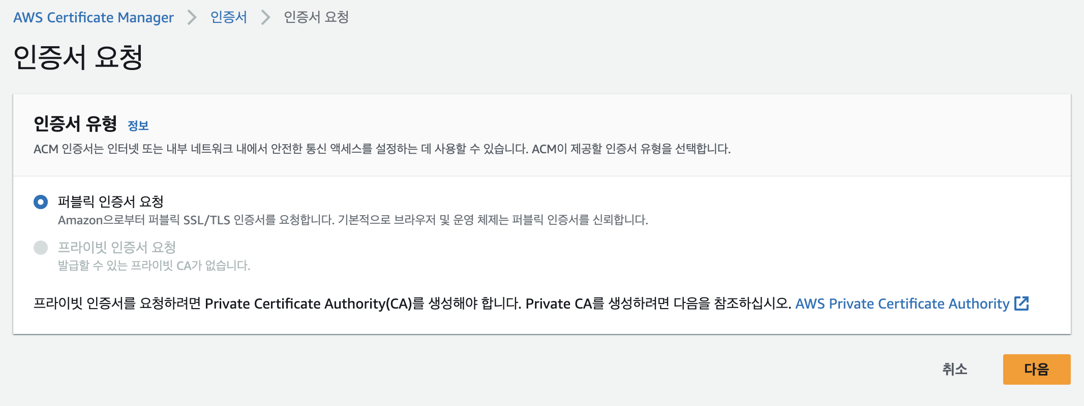 `퍼블릭 인증서 요청`을 선택하고 다음을 클릭한다.
