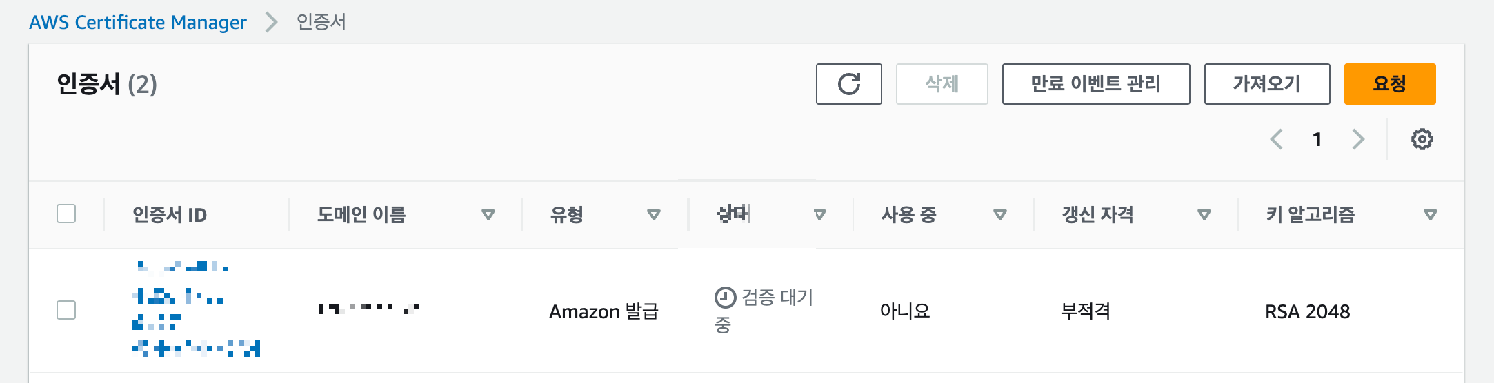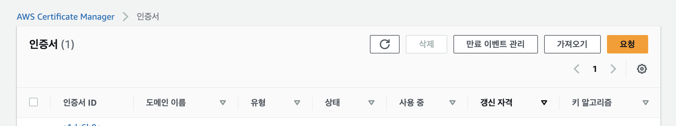 AWS 메뉴에서 Certificate Manager에 접속한다. 그리고 아래 화면에서 요청을 클릭한다.