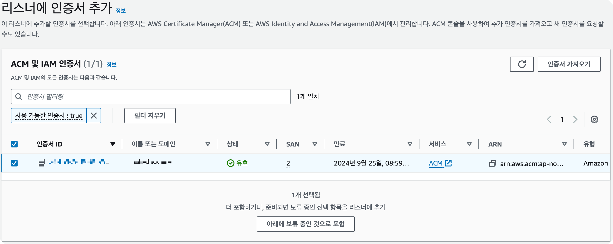 이동된 화면에서 이전에 발급받은 ACM을 선택하고 아래에 보류 중인 것으로 포함을 클릭한다.