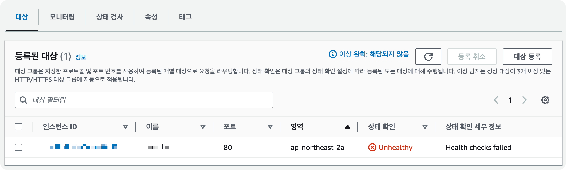 HTTPS 적용이 안 돼서 어떤 문제인지 확인해 봤더니, 등록한 모든 대상 그룹의 상태가 `Unhealthy`로 나와 있었다!