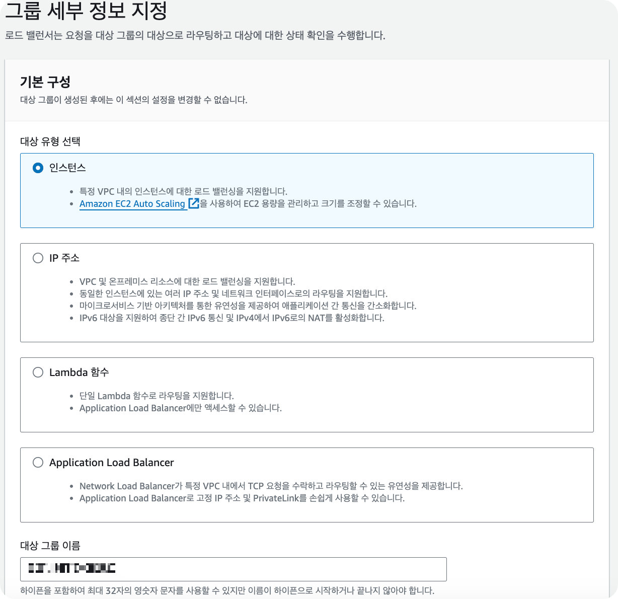 그룹 세부 정보 지정의 기본 구성에서 대상 유형은 인스턴스로 선택하고, 대상 그룹 이름을 입력한다.