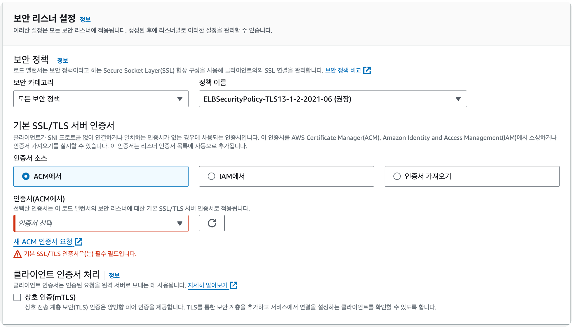보안 리스너 설정에서 EC2 인스턴스에 적용한 ACM을 선택한다.