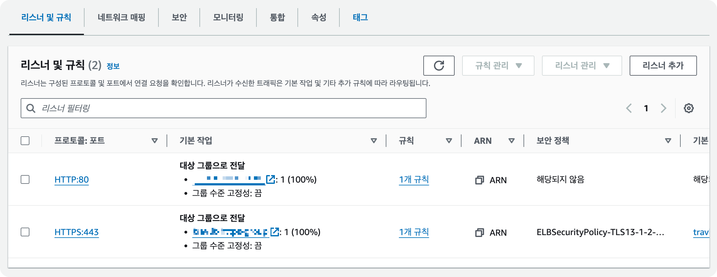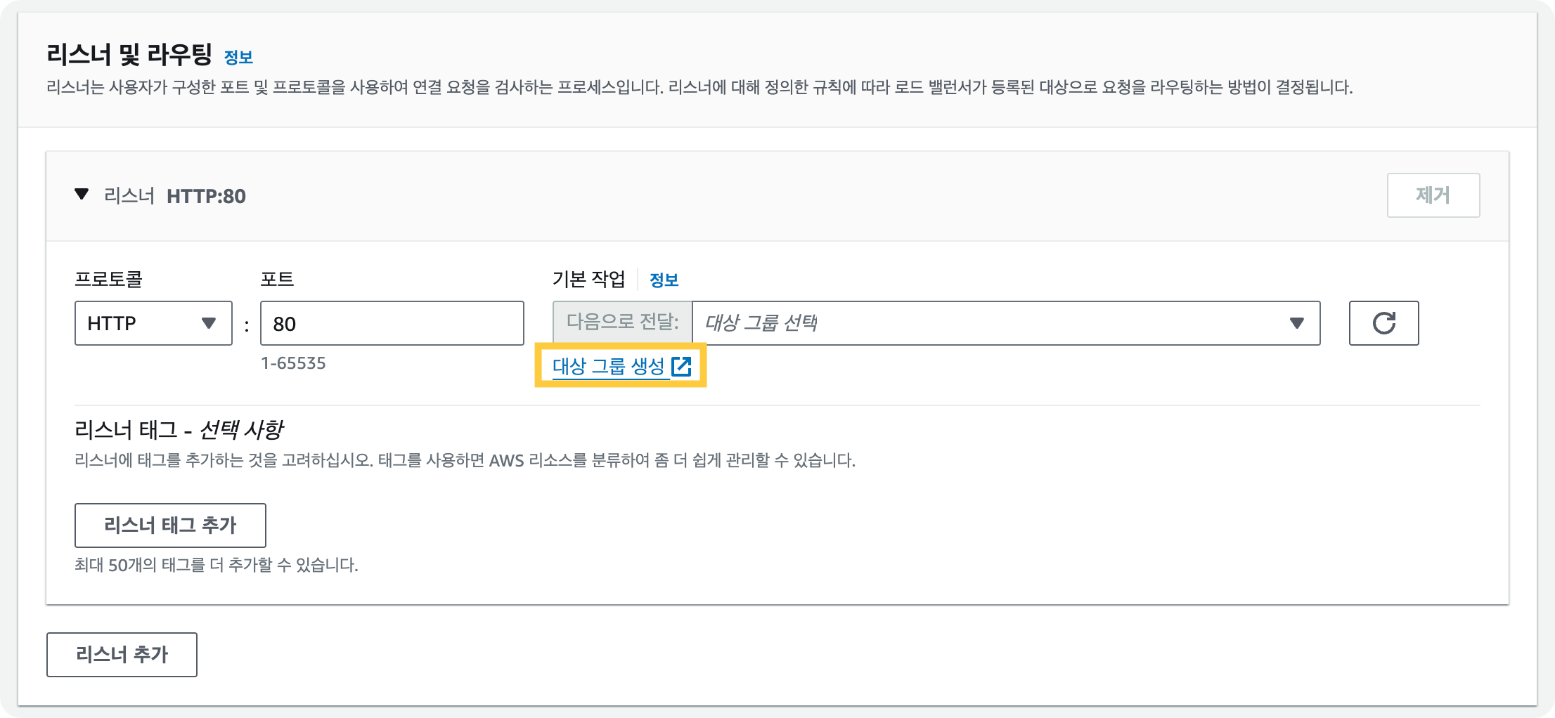 나중에 필요한 리스너나 규칙을 추가하려면 로드 밸런서 창으로 돌아와 리스너 및 규칙에서 리스너 추가를 클릭하면 된다.