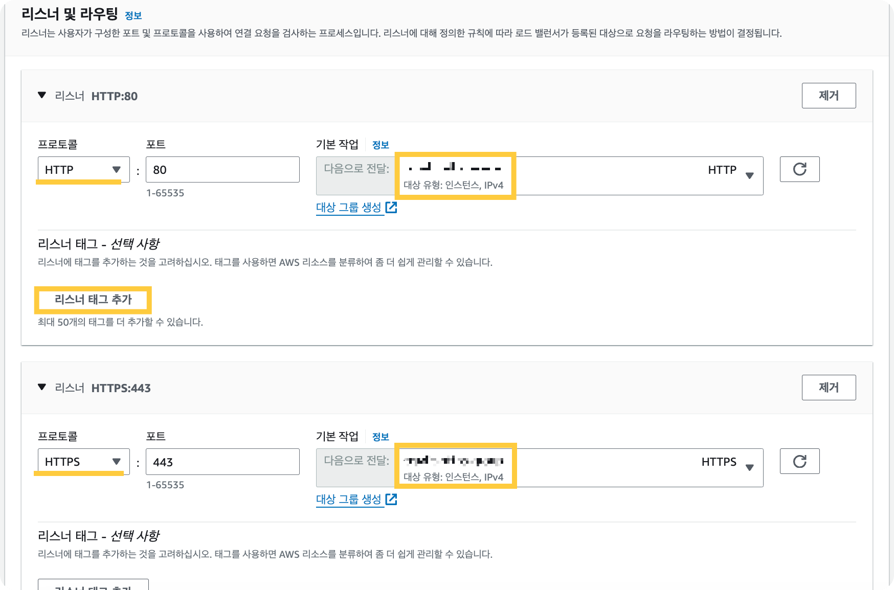 다시 리스너 및 라우팅으로 돌아와서 리스너 설정을 진행한다. 리스너 태그 추가를 클릭하여 HTTP, HTTPS 모두 생성하며, 모두 HTTP 대상 그룹을 선택한다. 생성한 대상 그룹이 보이지 않으면 옆에 새로 고침 버튼을 클릭하자.