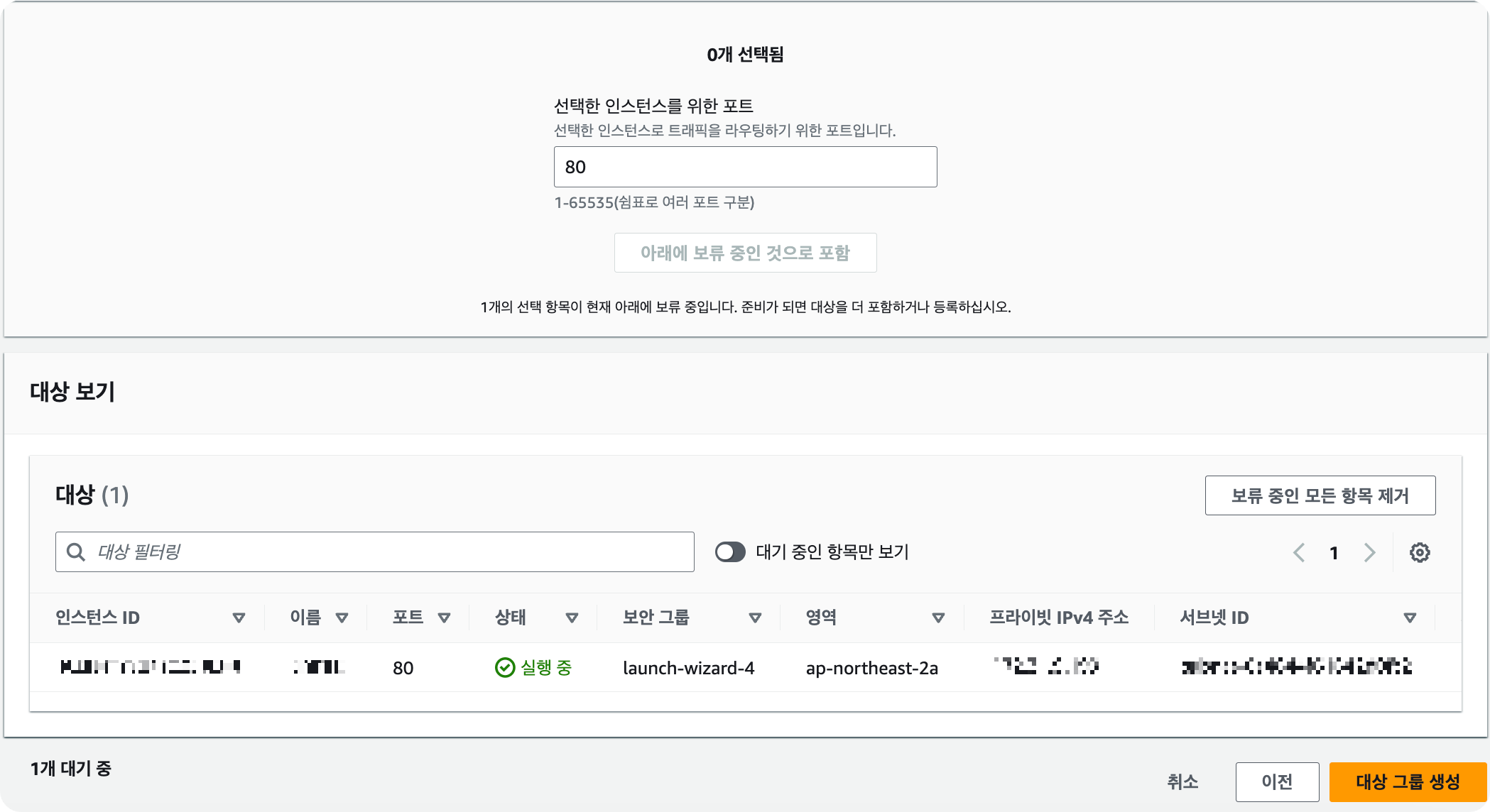 리스너 및 라우팅 차례이다. 여기에서 HTTP 80 포트와 HTTPS 443 포트를 설정한다. 우선 아래 화면에서 대상 그룹 생성을 클릭한다.