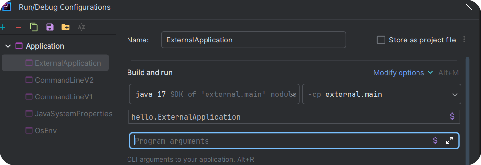 클릭 후 `Program arguments(CLI arguments)`에 다음과 같이 입력한다.