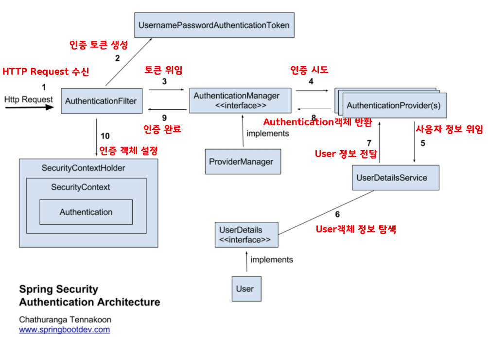 5, 실제 DB를 통해 사용자의 인증 정보를 가져오는 `UserDetailsService`에게 인증 토큰 객체에 담긴 사용자 정보를 전달한다.
