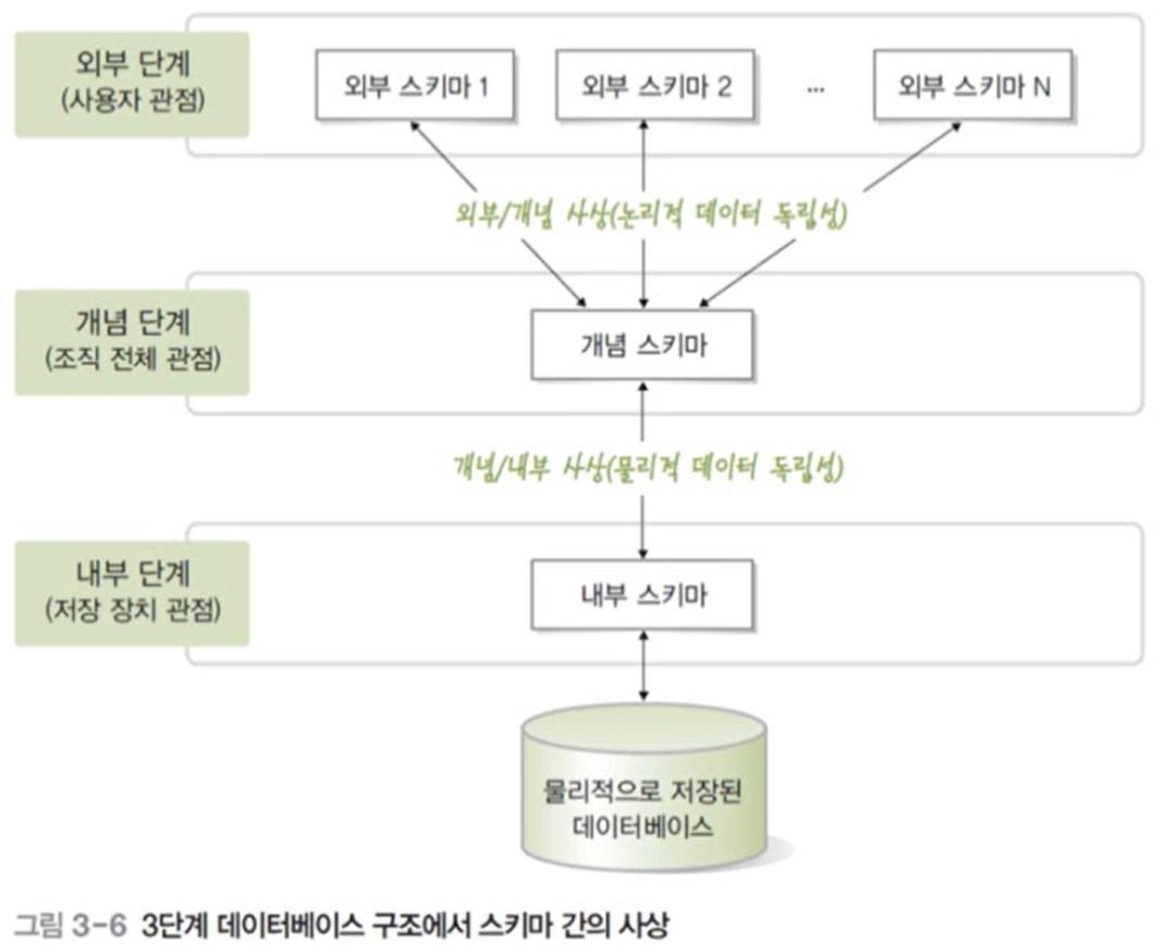 - 데이터베이스를 쉽게 이해하고 이용할 수 있도록 하나의 데이터베이스를 관점에 따라 세 단계로 나눈 것