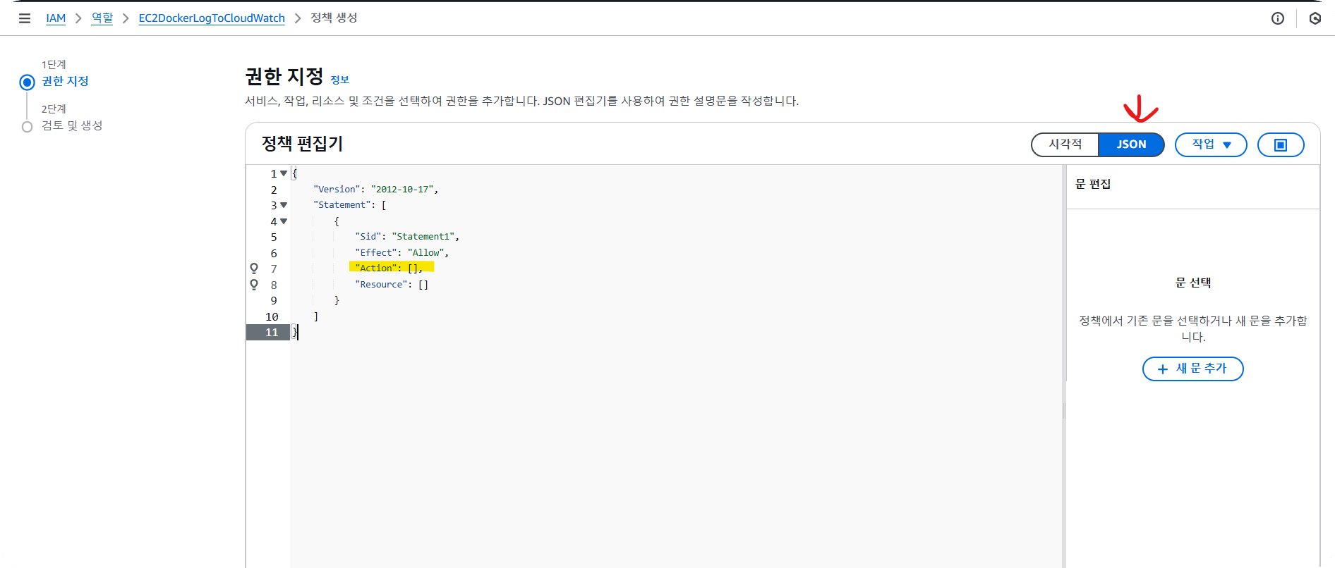 그리고 아래와 같이 Action에 Docker 공식 문서에서 지정한 정책을 추가한다. 이후 스크롤을 내려 다음을 클릭한다.