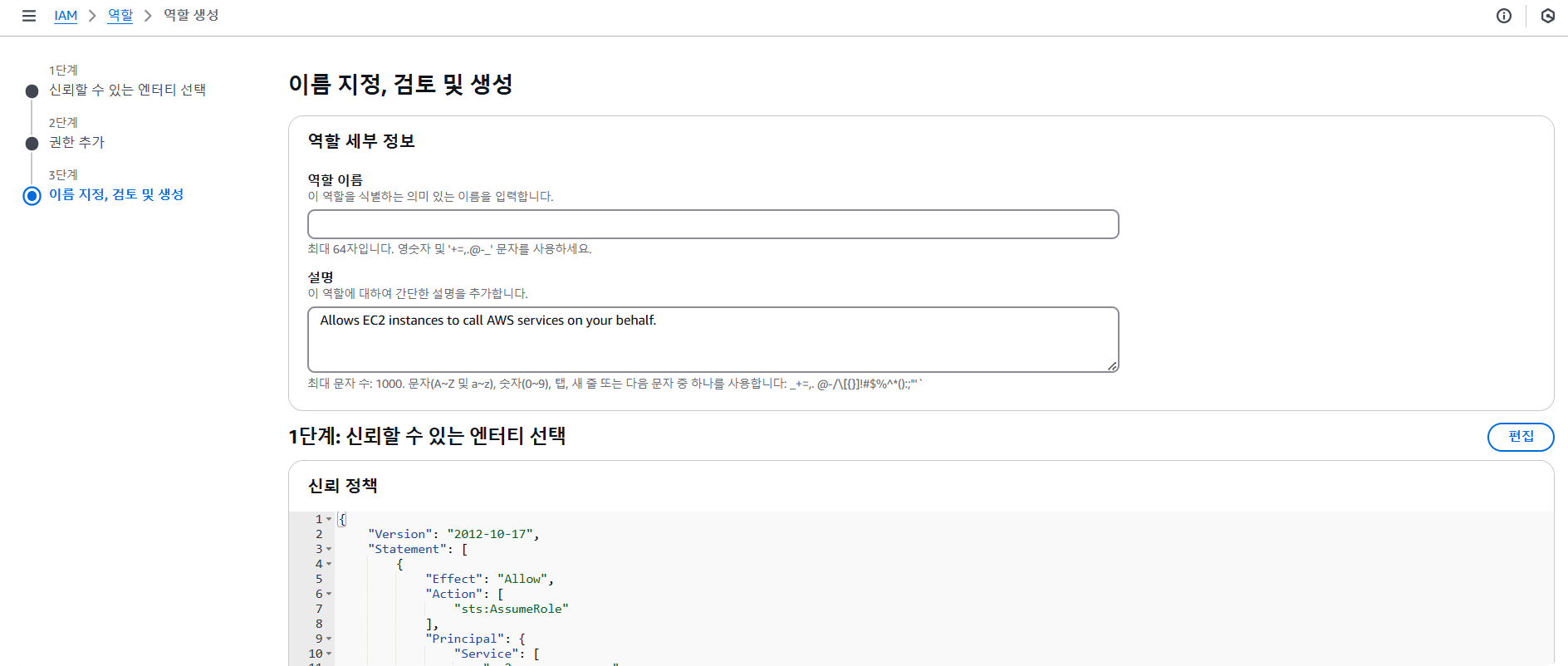 다음으로 넘어가면 3단계가 나온다. 여기에서는 IAM 역할에 이름을 지정하고 설명과 태그를 추가할 수 있다. 이름은 해당 역할이 어떤 목적으로 생성되었는지 설명할 수 있도록 짓는다. 이후 아래로 스크롤을 내려 역할 생성을 클릭한다.