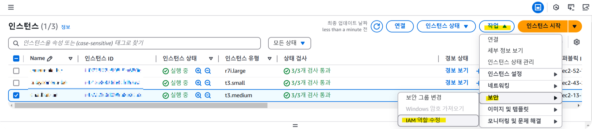 이제 생성한 역할을 Docker 데몬이 실행되고 있는 EC2에 연결해야 한다. EC2 서비스로 이동한다. 역할을 연결할 EC2를 선택하고 작업 > 보안 > IAM 역할 수정을 클릭한다.