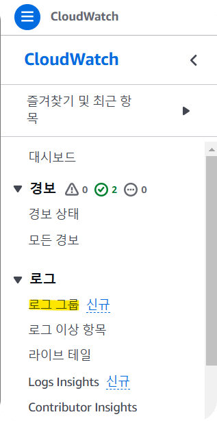 CloudWatch로 이동하여, 왼쪽 메뉴에서 로그 > 로그 그룹을 클릭한다.