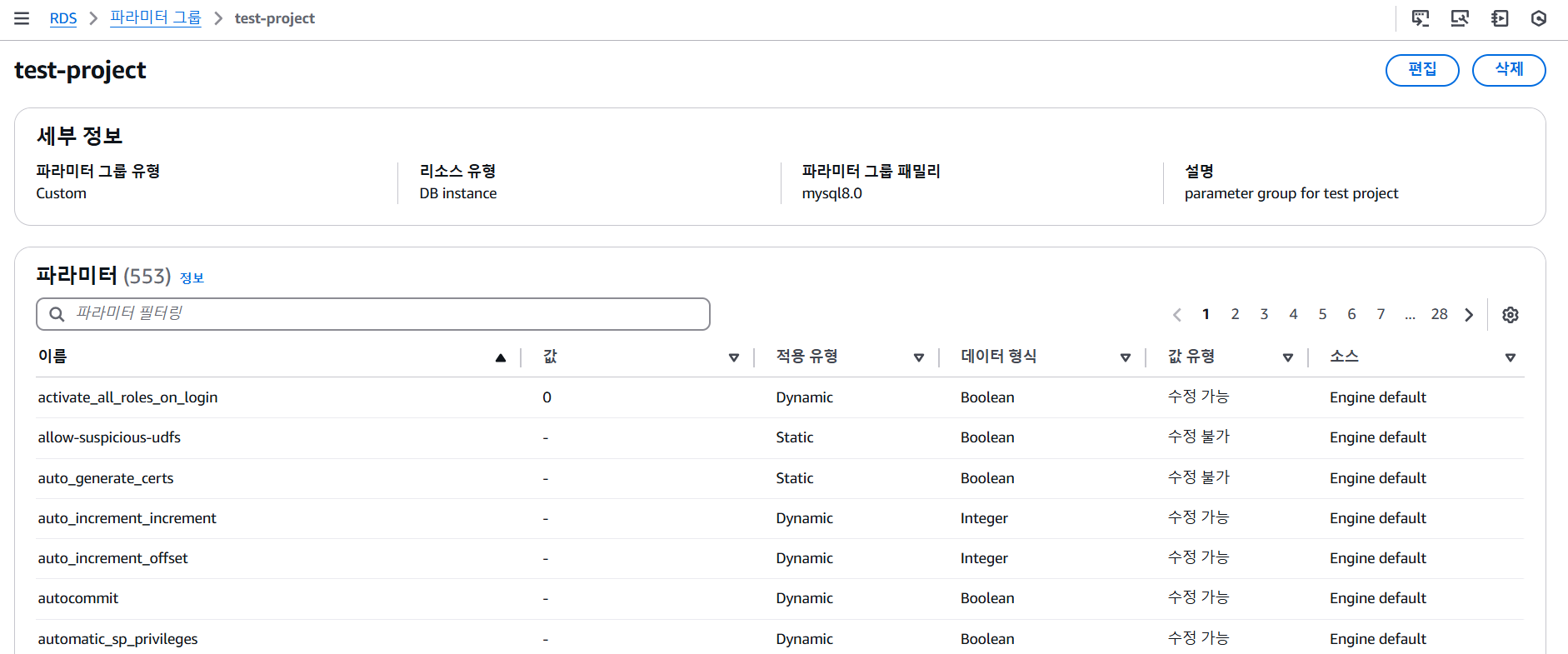 생성한 파라미터 그룹의 이름을 클릭하면 파라미터 설정을 변경할 수 있는 화면으로 이동한다. 편집을 클릭한다.
