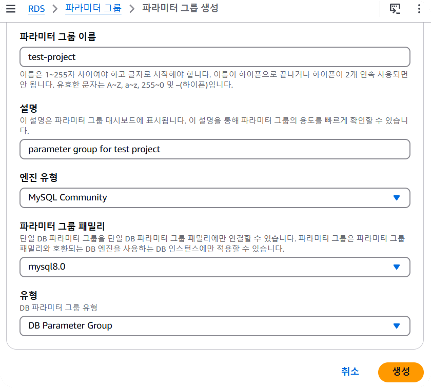 해당 DB 인스턴스의 설정을 바꾸는 일이므로 DB 파라미터 그룹을 새로 생성하여 수정하기로 했다.