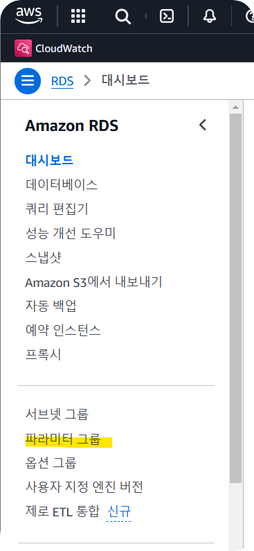 RDS 서비스의 오른쪽 메뉴탭에서 파라미터 그룹을 클릭한다.