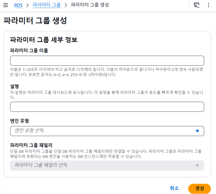 클릭하면 아래와 같이 파라미터 그룹 생성 화면이 나온다.