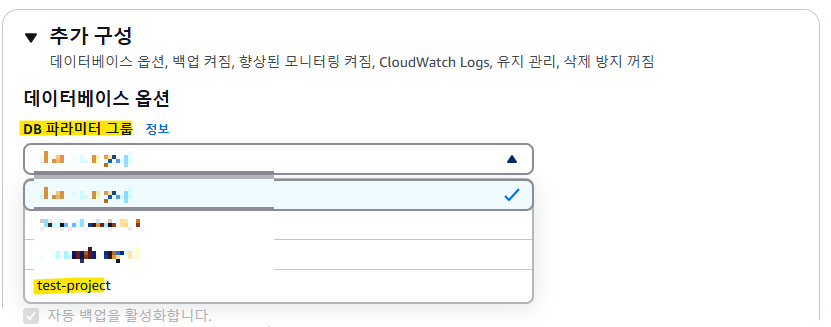 추가 구성 > 데이터베이스 옵션에 DB 파라미터 그룹을 설정하는 부분이 있다. 방금 생성한 파라미터 그룹을 선택한다.
