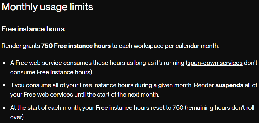 Render는 여타 다른 클라우드 플랫폼이 그렇듯 여러 플랜과 인스턴스 타입을 지원한다. 그중에서 내가 사용 중인 건 Hobby 플랜의 무료(Free) 인스턴스이다. 해당 스펙이 규모가 작은 개발 단계에서 사용하기 적합했다. 선택한 다른 이유로는 빌트인 PostgreSQL을 지원하는 것과 GitHub로부터 자동 배포를 해준다는 점이었다. 월마다 무료 사용량으로 750시간이 주어지는 것도 충분했다. (자세한 사항은 Render에서 확인)