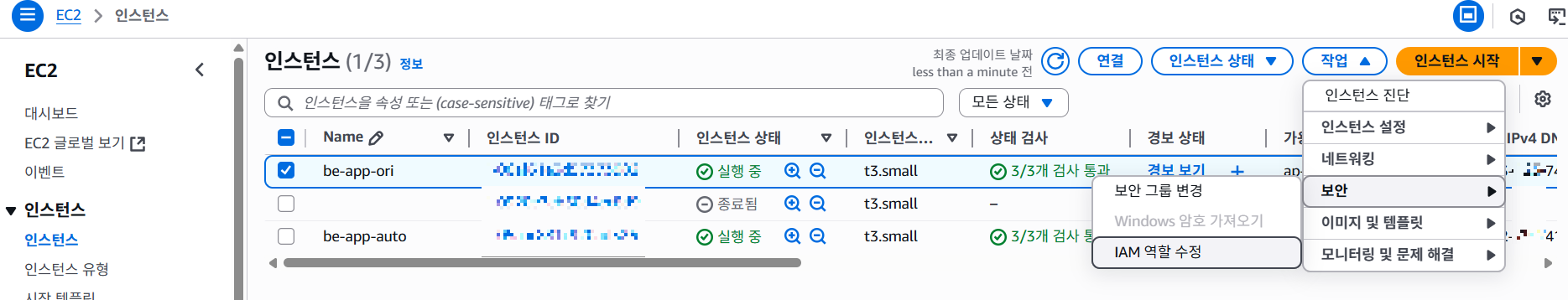 CI/CD를 적용할 인스턴스를 선택하고, 작업 > 보안 > IAM 역할 수정을 클릭한다.