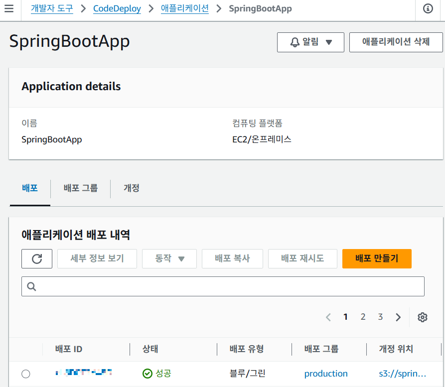 CodeDeploy 상태도 확인해 보자. CodeDeploy 애플리케이션에서 배포나 배포그룹 탭으로 이동하고, 성공이 있는 것을 확인할 수 있다.