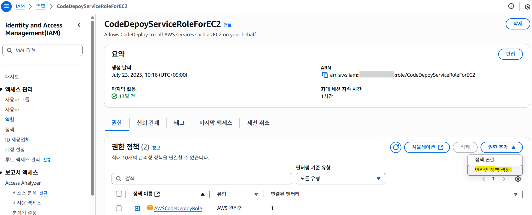 CodeDeploy도 수정해야 한다. 우선 CodeDeploy의 IAM 역할부터 수정한다.