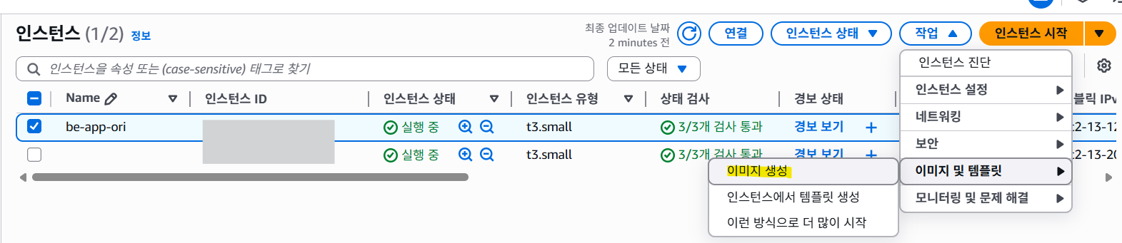 EC2 > 인스턴스로 이동하여 오토 스케일링을 적용할 인스턴스를 선택하고, 작업 > 이미지 및 템플릿 > 이미지 생성을 클릭한다.