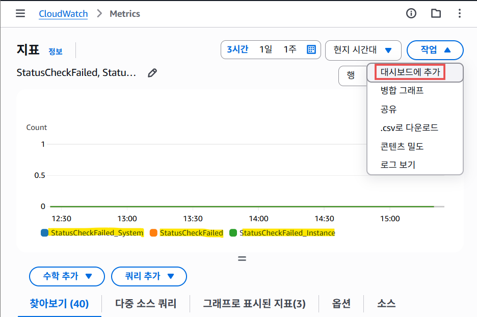 위 지표들은 AWS/EC2 네임스페이스의 인스턴스별 지표 차원에서 확인할 수 있다. 해당 지표들을 선택하고 "작업 > 대시보드에 추가"를 클릭한다.